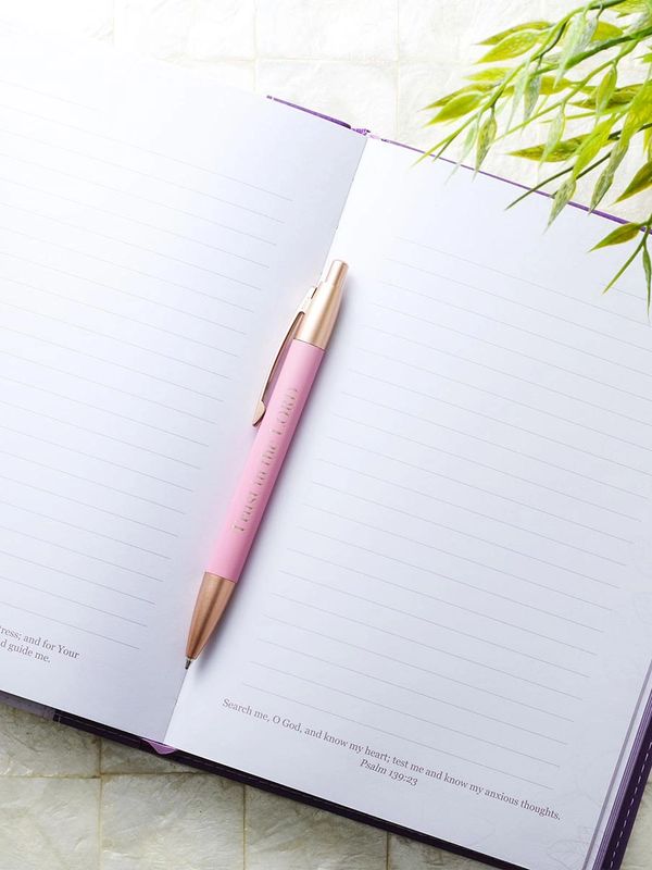 The Trust in the LORD Pink Classic Gift Pen is a beautiful reminder that human mortals can never presume to know God's mind, but if we trust the plans He has for our lives, even when we don't understand them, the LORD will lead us. Pink barrel, Rose gold tip, clip, lower cap, and retractable plunger, Rose gold engraved sentiment on the pen's barrel, Pink hinged gift box with printed edge and rose gold sentiment, Trust in the LORD with all your heart, Black ink, Medium ballpoint, Retractable point,